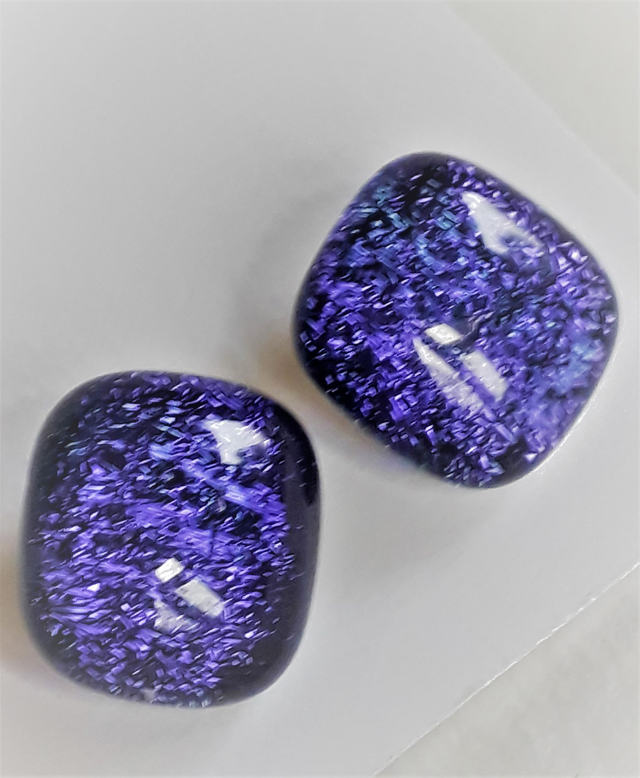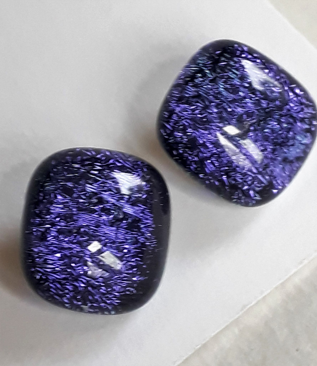 Dichroic glass gains its sparkle and reflectivity from multiple layers of metal oxides coating the surface, and light reflecting from the surface gives different colours depending on the angle it is seen from. I have taken photographs from multiple angles to show the variation in colour within each piece - some are more dramatic than others - but this has not been an easy task...