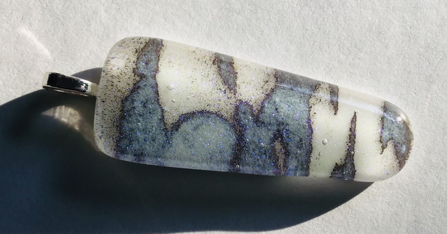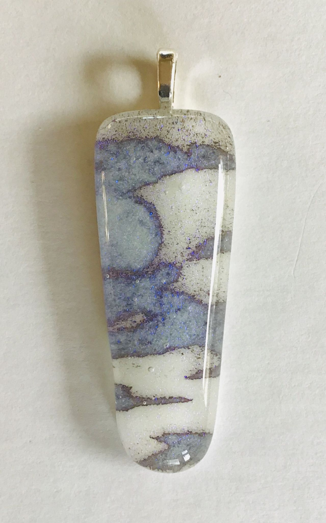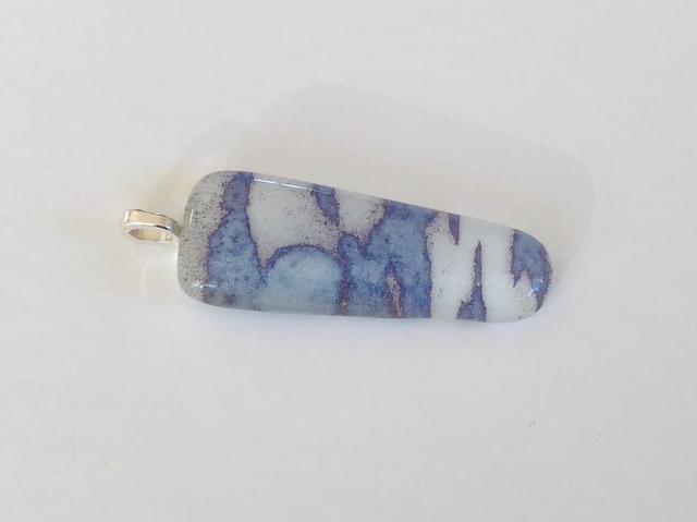Fused glass pendants using only 2 colours of reactive glass overlaid with clear dichroic glass to create a coloured shimmer. Each piece is unique and will be supplied with a length of black cord. Findings are silver plated.