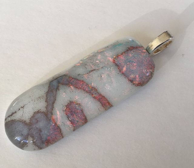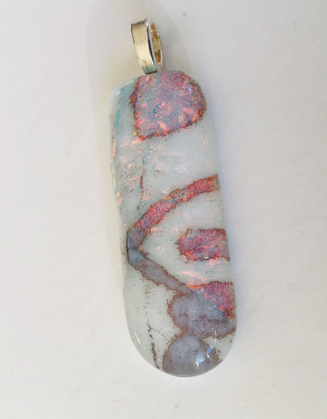 Fused glass pendants using only 2 colours of reactive glass overlaid with clear dichroic glass to create a coloured shimmer. Each piece is unique and will be supplied with a length of black cord. Findings are silver plated.