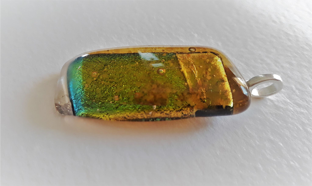 Fused glass/dichroic glass pendant with silver plated bail . Colour: gold/green. Size approx 4 x 2 cm